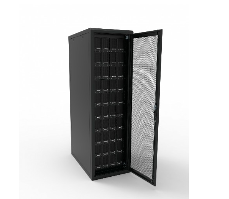 - DC-автомат защиты установлен на каждую полку батарей и расположен спереди. Общий автоматический выключатель шкафа батарей и модуль подключения расположены сзади. При необходимости можно сконфигурировать шкаф батарей с общим автоматическим выключателем и подключением спереди, что уменьшит количество полок батарей в шкафу на две.